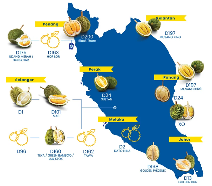 在馬來西亞,大約有200個榴蓮品種有自己獨特的風味和香氣。同時它們也對適宜的生長條件也特定的需要,例如降雨,海拔,溫度和土壤結(jié)構(gòu)。榴蓮僅在成熟季節(jié)才有供應那發(fā)生在每年的六月和七月。那個時節(jié)成熟后從樹上自然掉落的榴蓮,往往會含有較多的果肉和更濃郁的香氣。